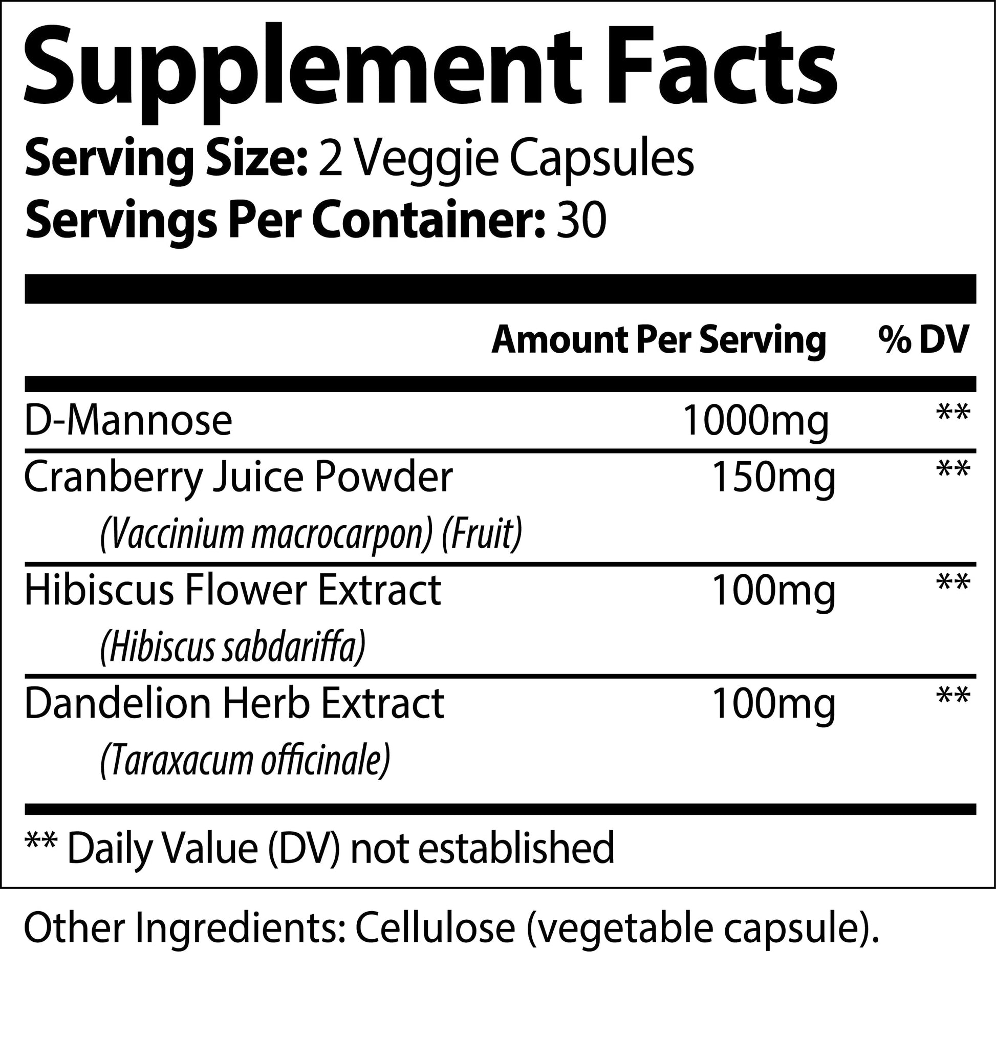 D-Mannose, Cranberry Juice Powder, Hibiscus, and natural Dandelion herb are included in each capsule. This powerful combination helps remove the biofilm that adheres to the bladder walls of your urinary tract, keeping them healthy and free of infection.†