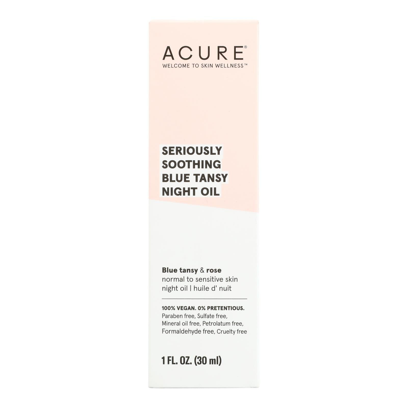 Normal to sensitive skin. Welcome to skin wellness. Health is beautiful. We believe that skin wellness means helping your skin thrive with soothing hydration and botanical ingredients. Thrive on! No need to feel blue with our antioxidant rich blue tansy oil. A concentrated blend of nourishing botanicals to soothe and refresh thirsty skin. This night time oil is used in place of a night cream for those seeking deep hydration and balance. Your goal soothing hydration. Our Solution: blue tansy; kale; argan oil; kukui oil; yarrow. 100% vegan. 0% questionable. Paraben free, sulfate free, phthalate free, mineral oil free, petrolatum free, silicone free, cruelty free. FSC: Mix - From responsible sources. www.fsc.org. acure.com. Made in the USA of domestic & global ingredients& components.
