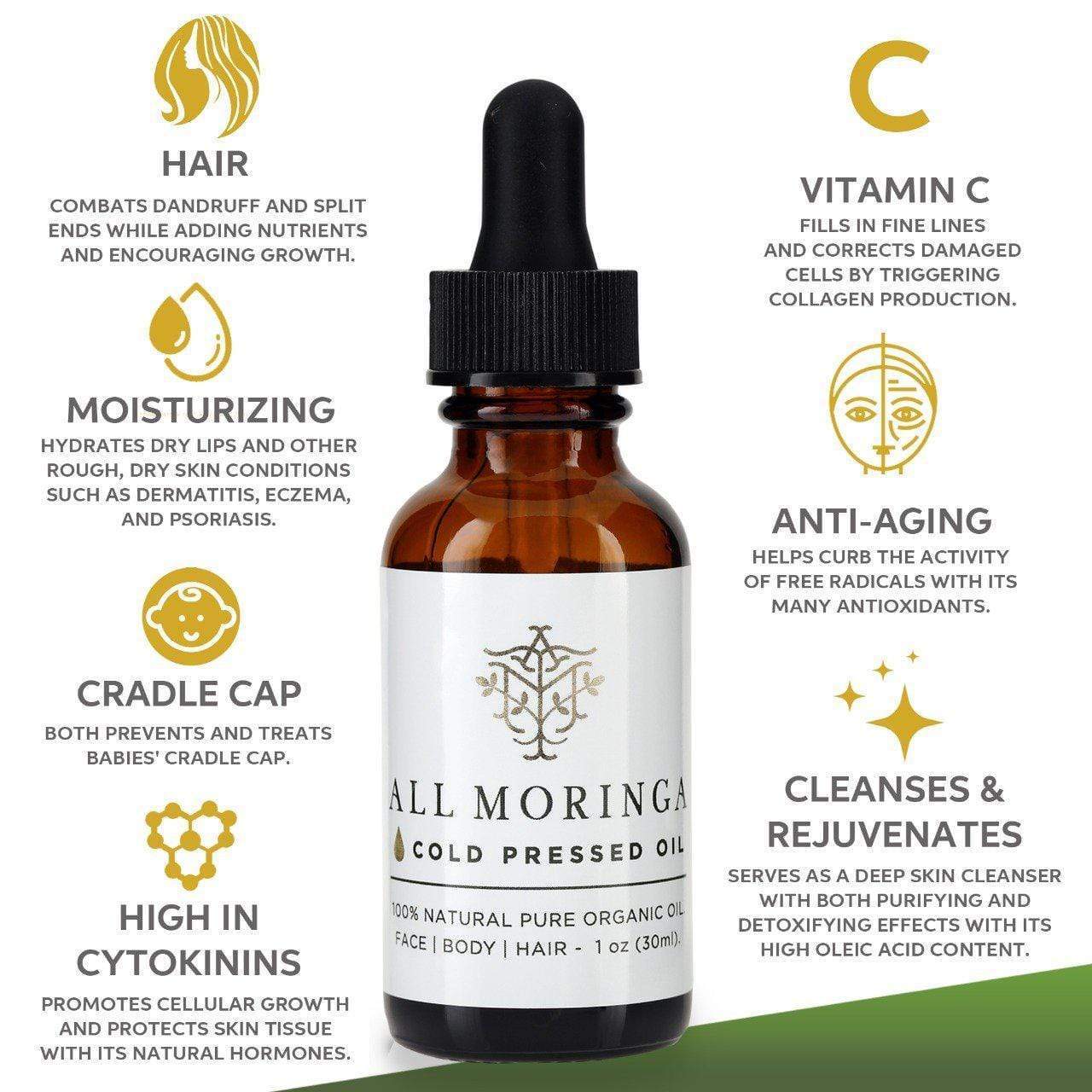Made from the highest quality, 100% organic Moringa Oleifera seeds, our all-natural Moringa oil (ben oil) is a moisturizer and healing agent for your whole family in one bottle.